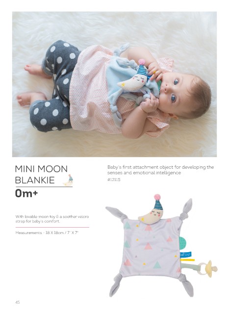 mini moon Baby’s first attachment object for developing the senses and emotional intelligence blankie #12115 0m+ With lovable moon toy & a soother velcro strap for baby’s comfort. Measurements - 18 X 18cm / 7” X 7'' 45