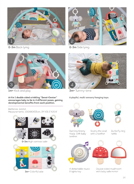 A 4 in 1 double sided crinkling “Sensi-Center” 6 playful, multi sensory hanging toys: