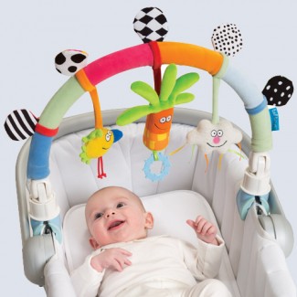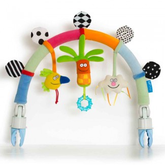 soft pram arch with rattling toys and crinkling flaps for fun and development