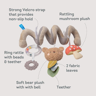 - All-in-One Entertainment: Combines a soft plush bear with a bell, a rattle mushroom, textured teethers, a beaded ring rattle, sensory leaves, and dangling elements — offering rich, long-lasting multi-sensory play.