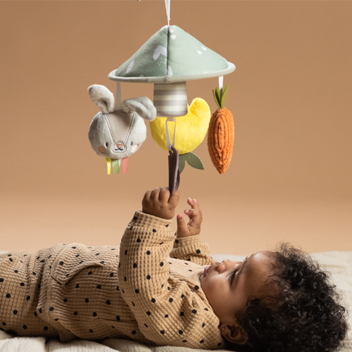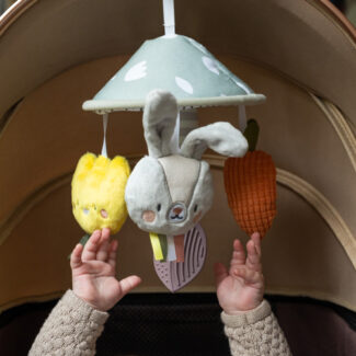 - Features a variety of elements including Rylee the bunny, a carrot and tulip hanging toys, that dangle from a green canopy, encouraging development of visual tracking skills.