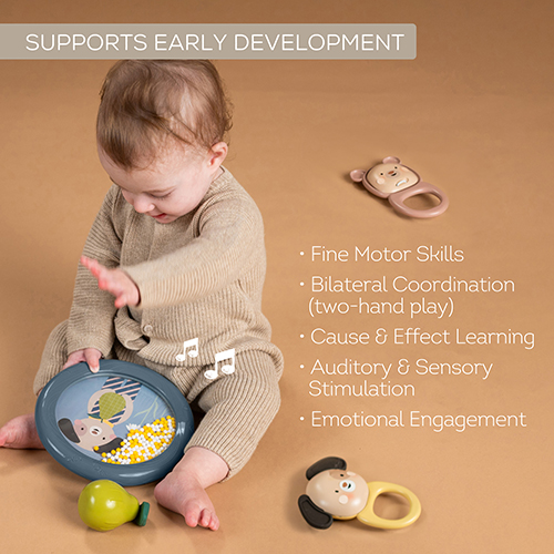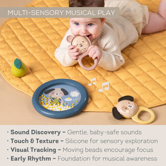 - 4 Essential Instruments: The kit includes a Pear Shaker with soothing beads and a silicone leaf, a Dog Bell with soft silicone ears, a lightweight Bear Clapper for rhythmic play, and an Ocean Drum that captivates attention with cascading colorful beads.