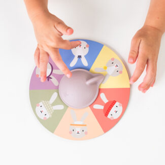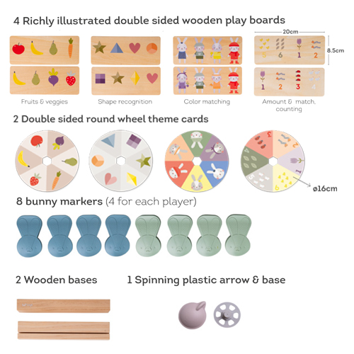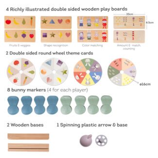 - This two-player educational game involves spinning the arrow and placing bunny pegs on the wooden play board based on the image that appears. The first player to place four bunnies on wooden play board wins, making it a fun and engaging way to foster cognitive skills and social interaction.