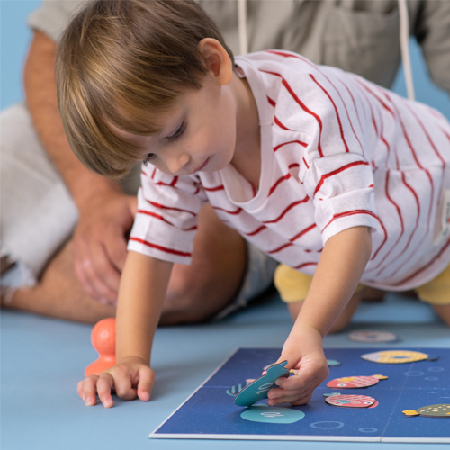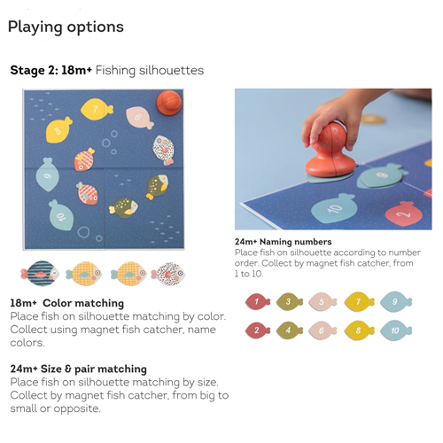 - Toddlers (12M+) will be thrilled to collect the fish using the magic fish catcher! The magic fish catcher includes a metal plate & the magnetic fish are attracted to it and require toddlers to use both hands to separate them. Young children can collect and organize fish by size, color or number. The game board is double-sided and suitable for two different age groups.
