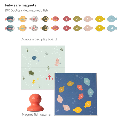 - Comes as a set of 10 double sided baby -safe magnetic fish & a double sided play board including a magic fish catcher unit.