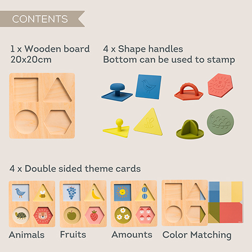 • Specifically designed to spark the curiosity of toddlers, this shape puzzle offers four beautifully illustrated replaceable themes, identifying animals, delving into the world of fruits, discovering colors and numbers.