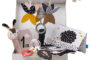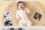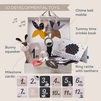 Contains 10 must-have newborn developmental products in 1 box.: a black and white crinkle book, ring toy with teethers and a crinkle leaf, six double-sided milestone cards, take along Chime bell mobile, and a bunny squeaker.