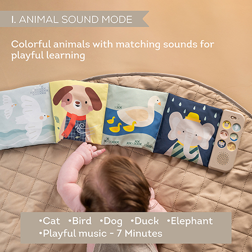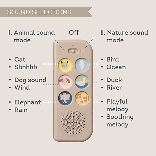 Animal Sound Mode – Five illustrated panels play realistic 3-second sounds (dog, cat, elephant, duck, and birds) to encourage sound recognition and engagement, along with a cheerful 7-minute lullaby to comfort and entertain your baby. Soothing Sound Mode – Features five calming nature sounds (shushing, ocean waves, rainfall, river flow, and heartbeat) that loop for 7 minutes – just enough to help baby fall asleep, plus a gentle lullaby to promote relaxation and comfort.
