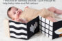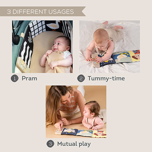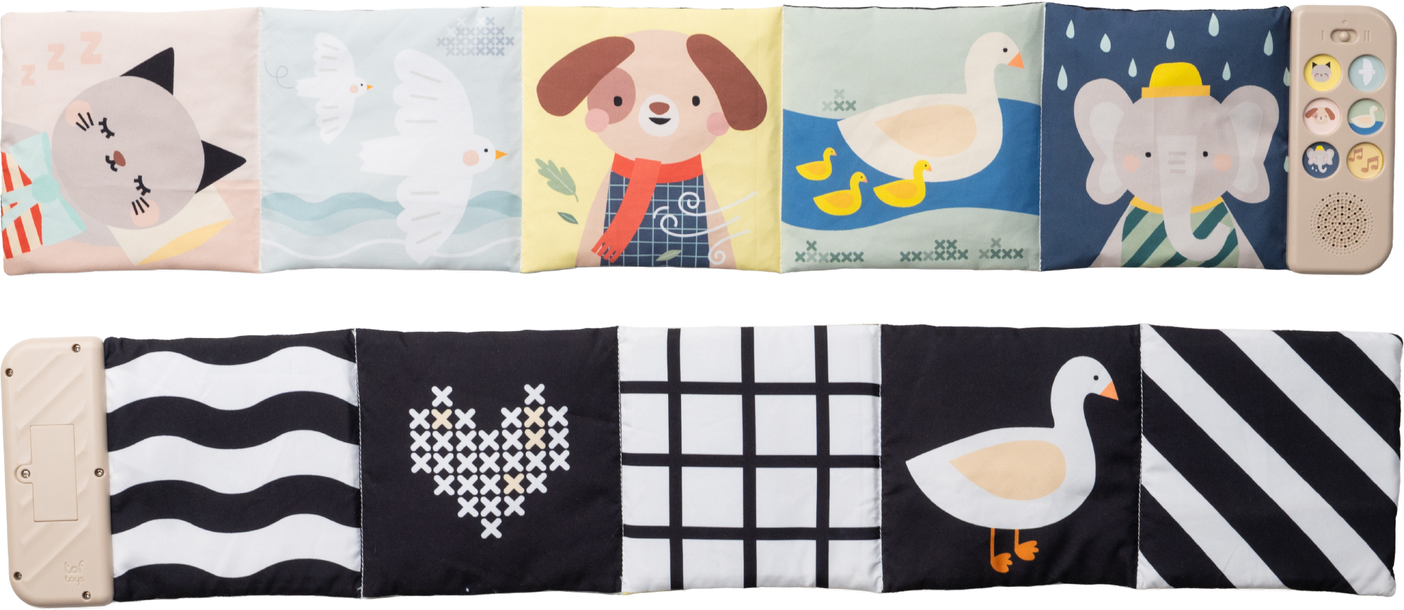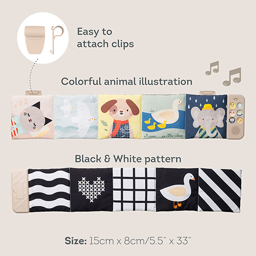 The Newborn Soothing Book is a soft, freestanding fabric book designed to calm and engage babies from day one. Featuring gentle sensory elements and easy-press buttons, it combines visual, tactile, and auditory stimulation to create a soothing, multi-sensory experience.