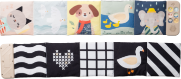 The Newborn Soothing Book is a soft, freestanding fabric book designed to calm and engage babies from day one. Featuring gentle sensory elements and easy-press buttons, it combines visual, tactile, and auditory stimulation to create a soothing, multi-sensory experience.