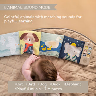 Animal Sound Mode – Five illustrated panels play realistic 3-second sounds (dog, cat, elephant, duck, and birds) to encourage sound recognition and engagement, along with a cheerful 7-minute lullaby to comfort and entertain your baby. Soothing Sound Mode – Features five calming nature sounds (shushing, ocean waves, rainfall, river flow, and heartbeat) that loop for 7 minutes – just enough to help baby fall asleep, plus a gentle lullaby to promote relaxation and comfort.
