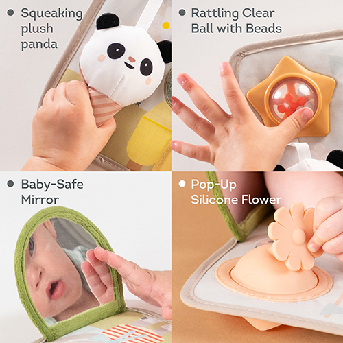 - All-in-One Multi-Sensory Play: Includes pop-it flower, peek-a-boo flaps, squirting panda, rattling ball, baby-safe mirror, pull & spin stripes, and more — offering endless interactive fun.
