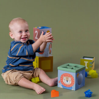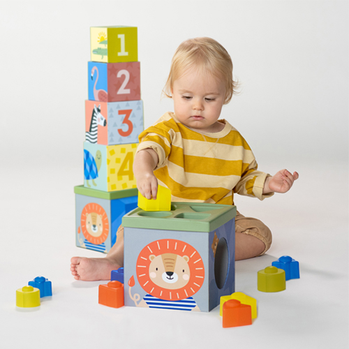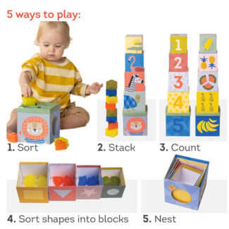 Baby will be busy learning new challenges while developing fine motor & problem-solving skills, enhancing baby`s curiosity and sense of discovery. Babies can stack all five boxes, then push the tower to see what happens. When baby is ready for a challenge, sort & match the right shapes into the right hole, & when they’re done, it’s fun to start it all again.